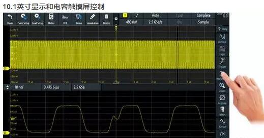 R&S RTB2000系列示波器配備了令人印象深刻的10.1英寸彩色電容觸摸屏。示波器的視覺(jué)體驗(yàn)是非常重要的環(huán)節(jié),用戶(hù)在日常工作中使用示波器很大部分時(shí)間用于觀(guān)測(cè)儀器的顯示。R&S RTB2000系列示波器提供了兩倍于同級(jí)別示波器的顯示屏幕大小和十倍于同級(jí)別示波器的顯示像素分辨率,幫助用戶(hù)更好地觀(guān)測(cè)被測(cè)信號(hào)。電容觸屏控制使用戶(hù)可以更快捷有效地完成示波器的操作。R&S RTB2000系列示波器的面世使用戶(hù)第一次可以在較低的預(yù)算下獲得大尺寸顯示和電容觸屏控制的示波器。