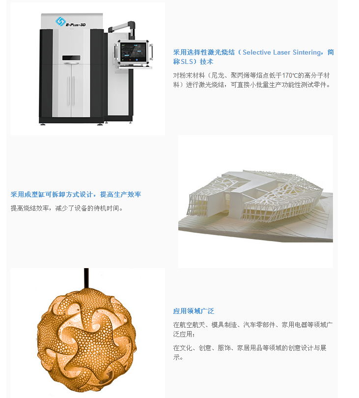 EP-P380 是支持尼龍材料的3D打印機(jī),該設(shè)備采用選擇性激光燒結(jié)(SLS)技術(shù)對(duì)粉末材料(尼龍、聚丙烯等熔點(diǎn)低于170℃的高分子材料)進(jìn)行激光燒結(jié),可直接小批量生產(chǎn)功能性測(cè)試零件。